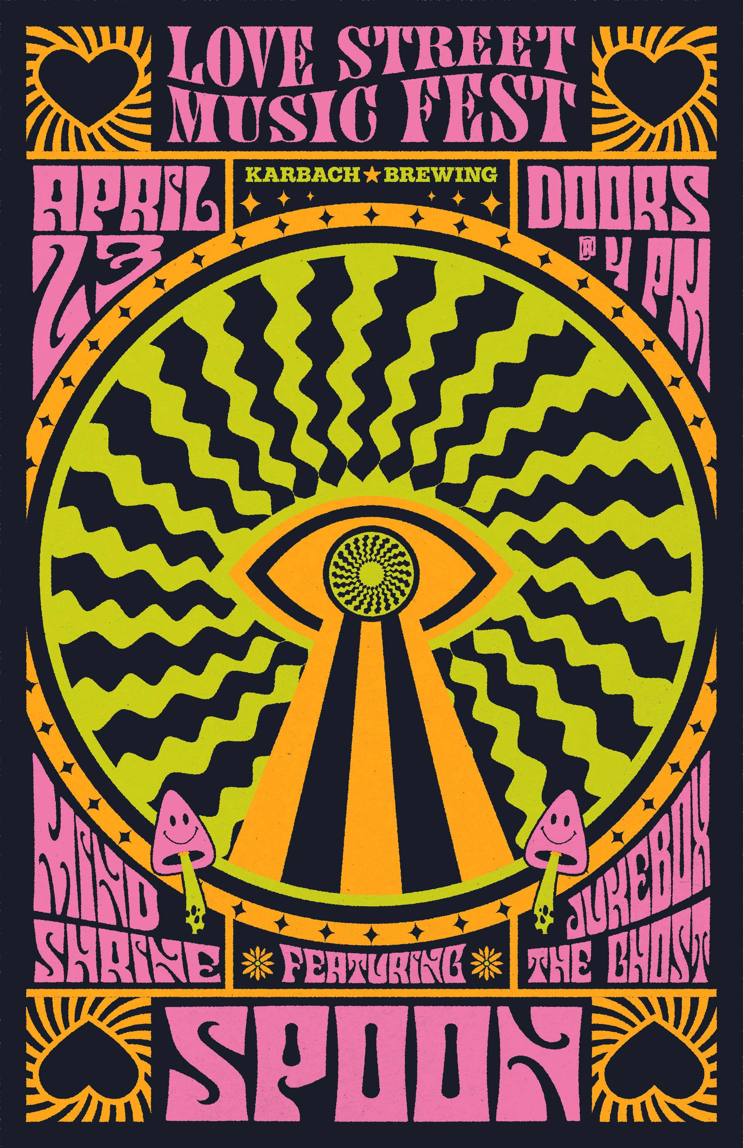 The brief for Love Street Music Fest was all about tapping into a psychedelic state of mind—awakening the third eye to unlock a whole new level of consciousness. Drawing inspiration from '60s gig posters and funky, free-flowing typography, the stage was set to create something truly far out.
